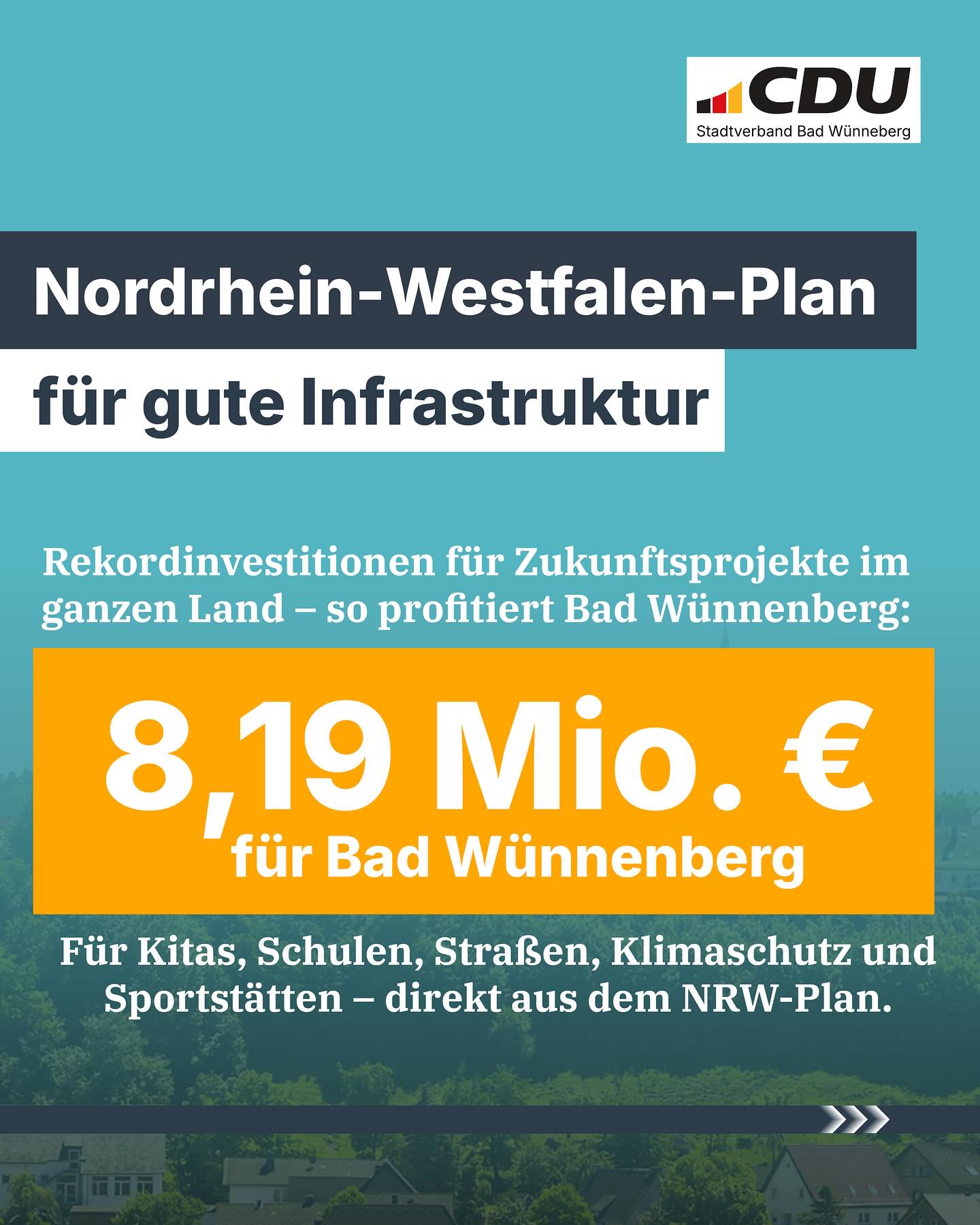 Ein starkes Signal für die Kommunen in NRW! 💪 Mit dem Nordrhein-Westfalen-Plan für gute Infrastruktur startet die CDU-geführte Landesregierung das größte Investitionsprogramm in der Geschichte unseres Landes. Bad Wünnenberg erhält 8,19 Mio. ? aus den pauschalen Landesmitteln ? für Bildung, Straßen, Klimaschutz und Sport. Hinzu kommen weitere Förderprogramme, die gezielt die örtlichen Bedarfe unterstützen sollen. Als CDU Bad Wünnenberg werden wir uns auch hier für eine starke Berücksichtigung unserer Stadt einsetzen. So bleibt Bad Wünnenberg auch in schwierigen Zeiten handlungsfähig ? und kann weiter in Zukunft und Lebensqualität investieren. 🌿🏫🚴♂️