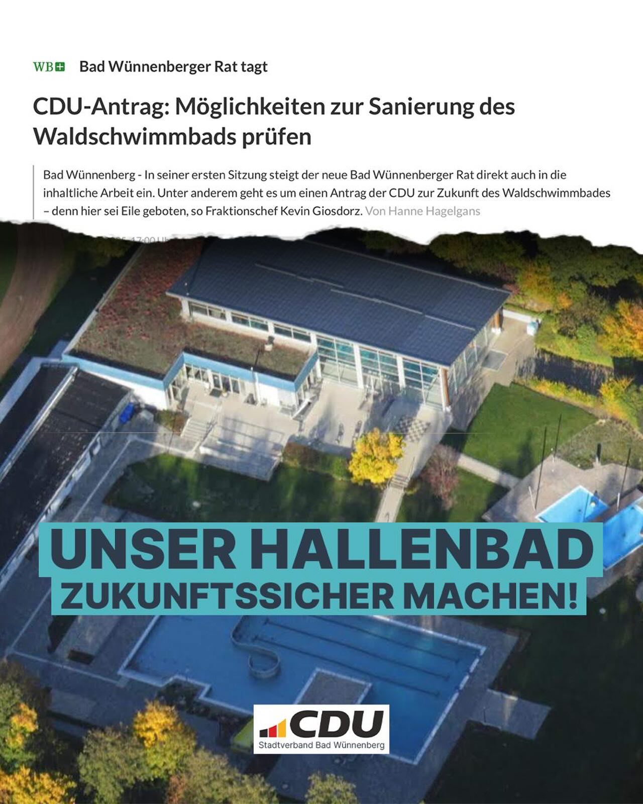 🏊🏻♀️Wir wollen das Hallenbad fit für die Zukunft machen!r r Unser Hallenbad ist unverzichtbar ? für Schulen, Vereine, Familien und für die vielen Kinder, die hier jährlich das Schwimmen lernen. Gleichzeitig kommt die Gebäudesubstanz aus den 70ern immer wieder an ihre Grenzen. Wenn ohnehin Sanierungen anstehen, sollten wir nicht nur "flicken", sondern die Chance nutzen, eine moderne und zukunftsfähige Lösung zu schaffen.r r Durch die aktuellen Fördermöglichkeiten eröffnet sich ein einmaliges Zeitfenster, in dem große Schritte möglich werden ? vielleicht sogar ein zusätzliches Lehrschwimmbecken, um die Schwimmausbildung langfristig zu stärken.r r Wir lassen jetzt vier Optionen prüfen:r 1️⃣ Sanierung des bestehenden Hallenbadsr 2️⃣ Sanierung + Anbau eines Lehrschwimmbeckensr 3️⃣ Kompletter Ersatzneubau inkl. Lehrschwimmbeckenr 4️⃣ Überplanung des gesamten Bäder- und Vereinskomplexesr r Unser Anspruch: Die beste Lösung für Bad Wünnenberg ? für mehr Lebensqualität, starke Vereine, guten Schulsport und die sichere Schwimmfähigkeit unserer Kinder. 💪